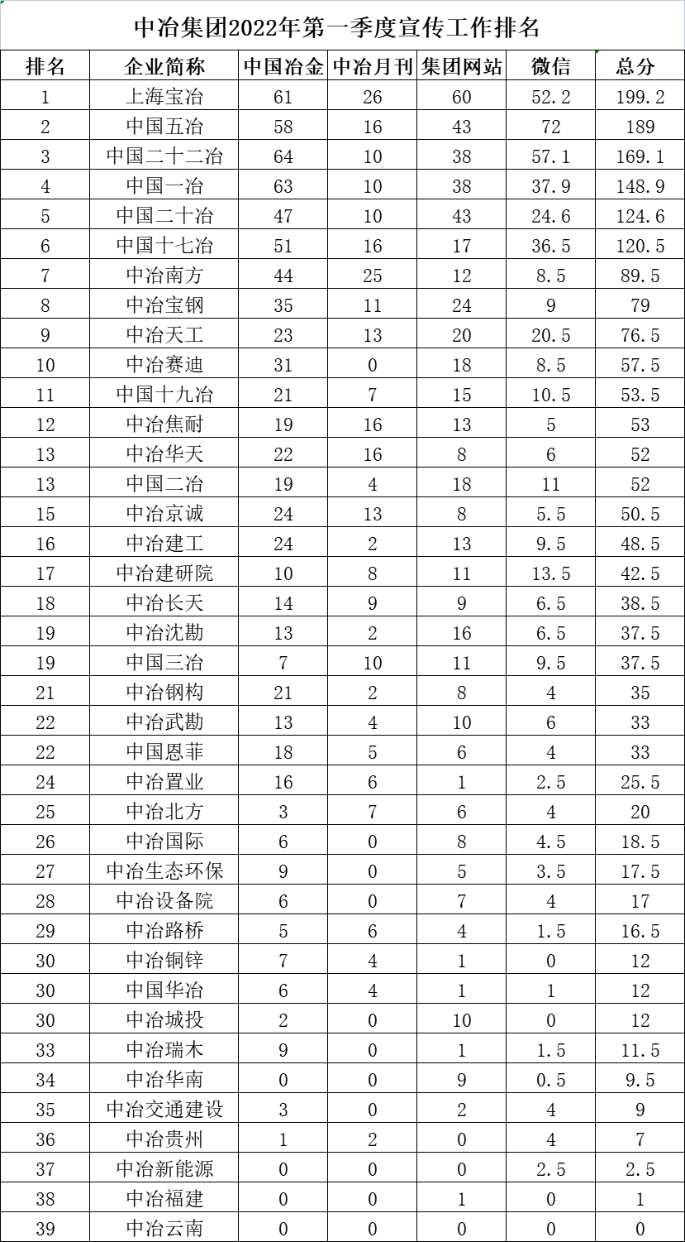 中冶集团2022年第一季度宣传工作排名